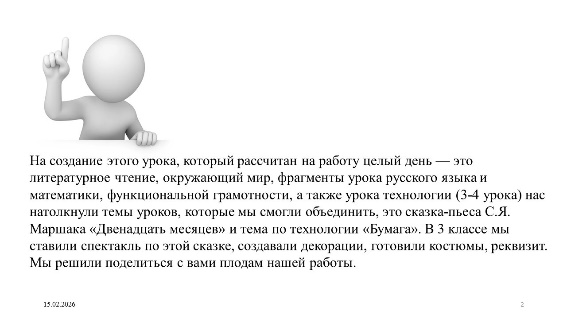 На создание этого урока, который рассчитан на работу целый день — это литературное чтение, окружающий мир, фрагменты урока русского языка и математики, функциональной грамотности, а также урока технологии (3-4 урока) нас натолкнули темы уроков, которые мы смогли объединить, это сказка-пьеса С.Я. Маршака «Двенадцать месяцев» и тема по технологии «Бумага». В 3 классе мы ставили спектакль по этой сказке, создавали декорации, готовили костюмы, реквизит. Мы решили поделиться с вами плодам нашей работы.