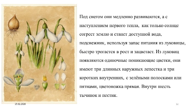Подснежник — многолетнее луковичное растение. Луковица округлая, до 3 см в диаметре. Значительную часть года растение-луковица проводит под землей. Людей всегда удивляла необычайная способность подснежника расти под снегом. Сам подснежник мал ростом, растёт под пологом тёмного леса, поэтому весь цикл вегетации должен у него закончиться до появления листвы на деревьях. С весны предыдущего года он накапливает запас питательных веществ в луковице. Тогда же закладываются зачатки органов будущего года — стебля листьев, цветка. Под снегом они медленно развиваются, а с наступлением первого тепла, как только солнце согреет землю и станет доступной вода, подснежник, используя запас питания из луковицы, быстро трогается в рост и зацветает. Из луковиц появляются одиночные поникающие цветки, они имеют три длинных наружных лепестка и три коротких внутренних, с зелёными полосками или пятнами, цветоножка прямая. Внутри шесть тычинок и пестик.
