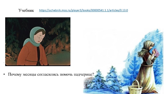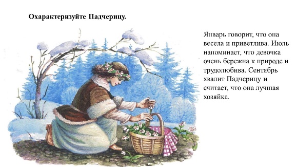 (Январь говорит, что она весела и приветлива. Июль напоминает, что девочка очень бережна к природе и трудолюбива. Сентябрь хвалит Падчерицу и считает, что она лучшая хозяйка.)