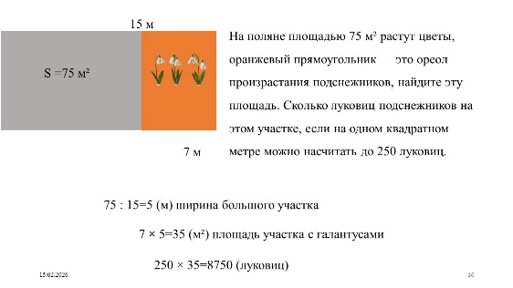 На поляне площадью 75 м² растут цветы, оранжевый прямоугольник — это ореол произрастания подснежников, найдите эту площадь. Сколько луковиц подснежников на этом участке, если на одном квадратном метре можно насчитать до 250 луковиц.