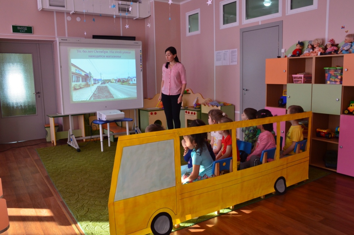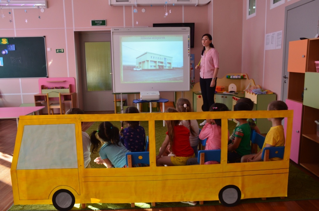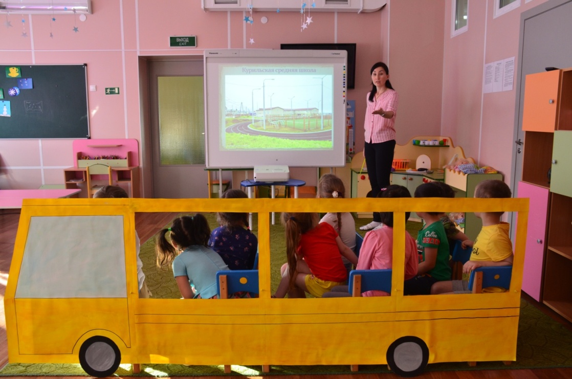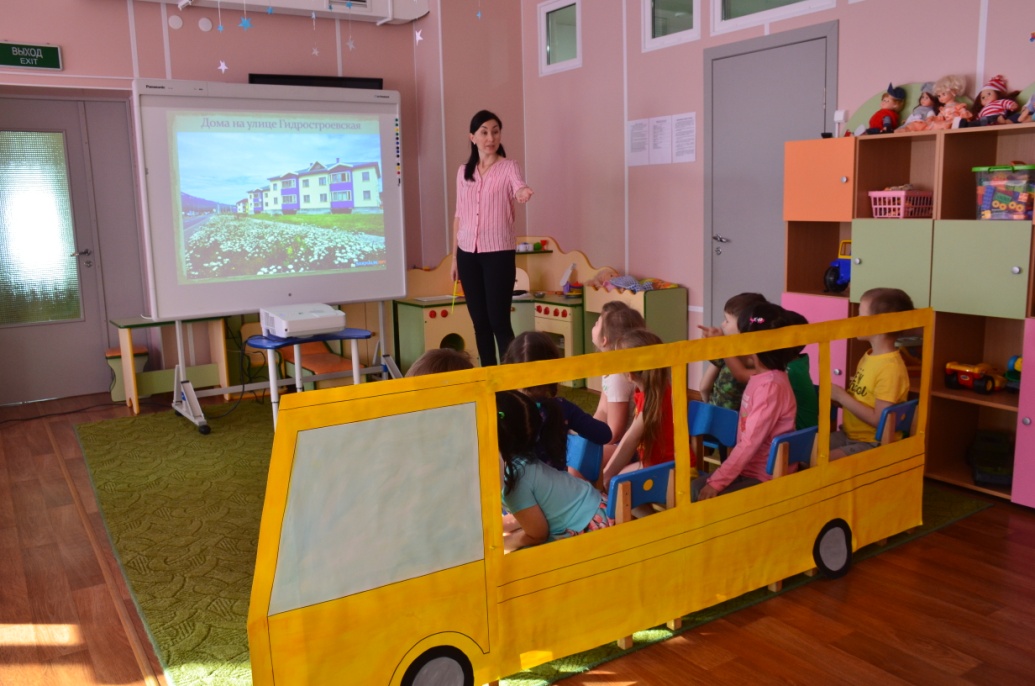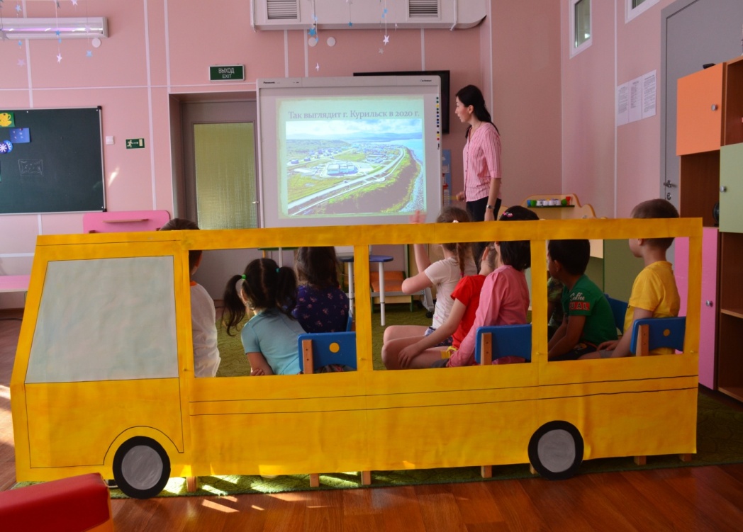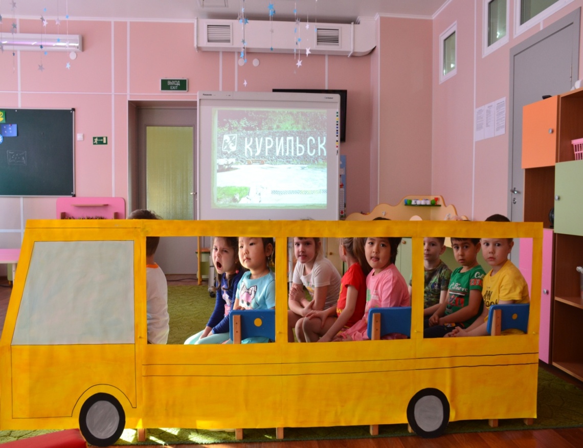 Воспитатель:Тогда занимайте свои места и поехали! Наше путешествие по Курильску начинается. (Проводятся элементы сюжетно-ролевой игры "Автобус"). Звучит музыка.