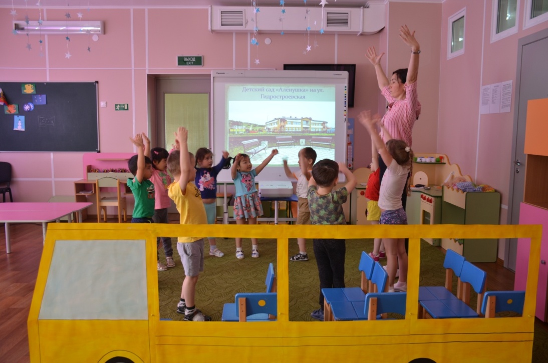 Воспитатель: Предлагаю отправиться дальше. Дети занимают места в «автобусе».