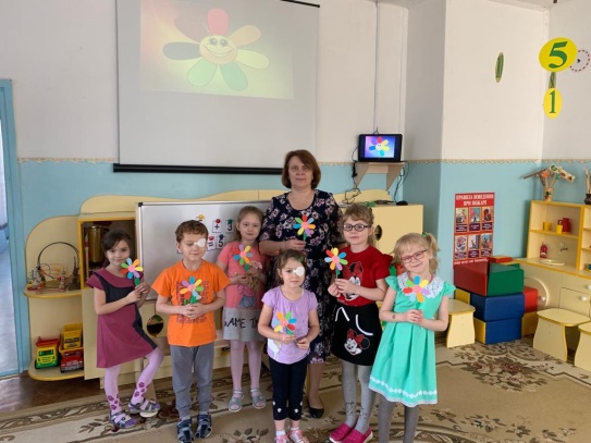 Воспитатель: Молодцы! И в награду за помощь Жени я хочу вам подарить по маленькому волшебному «цветику-семицветику» (Дети достают конверт и находят там на каждого ребёнка по волшебному цветку.)