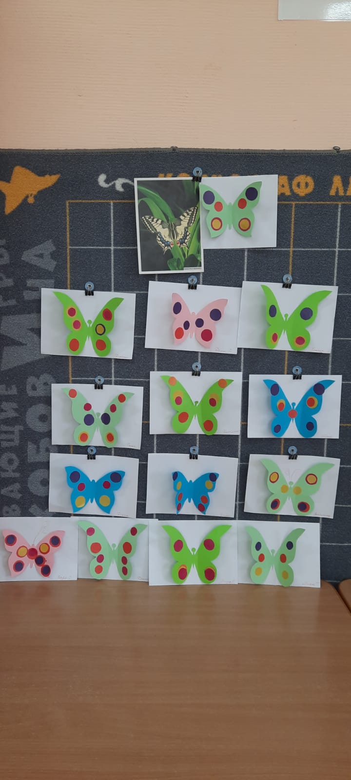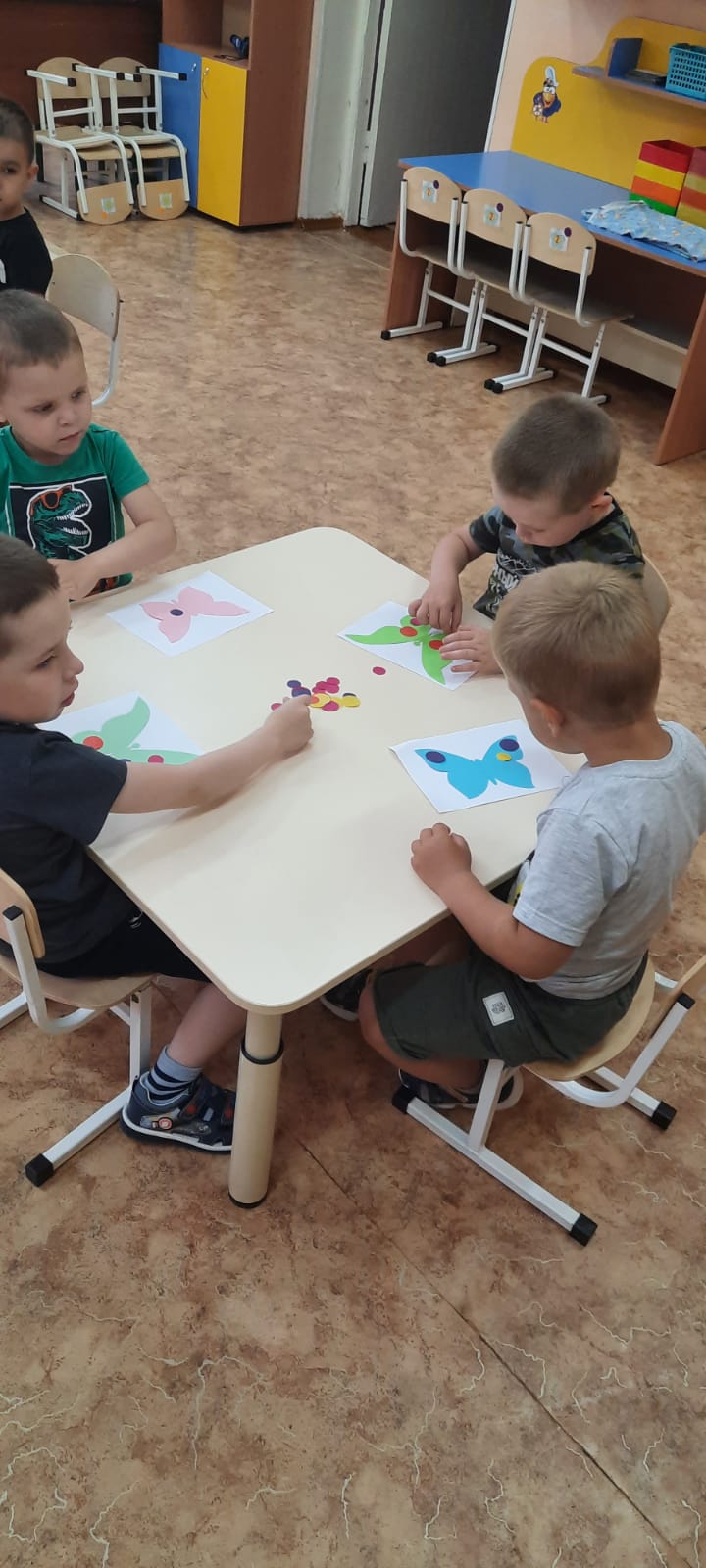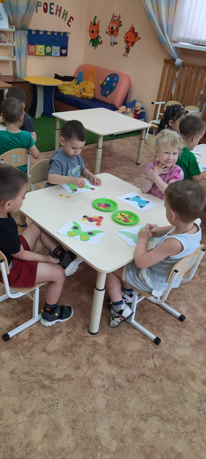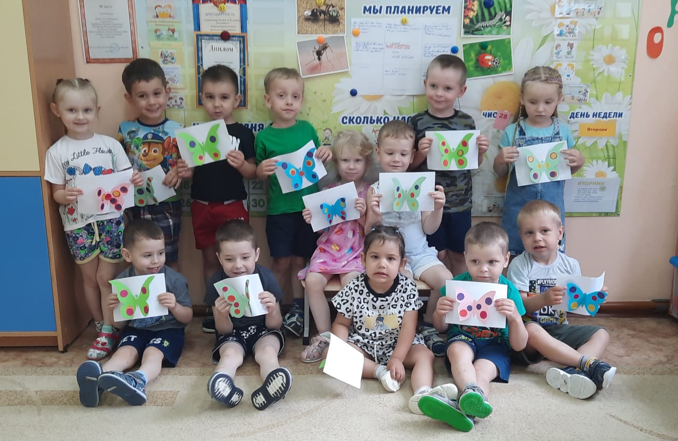 Когда всё необходимое для аппликации, было у детей на столах, обговорили с детьми последовательность выполнения аппликации. Затем дети сами украсили заготовленный шаблон бабочки. Вот что у нас получилось.