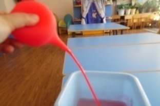 - Спринцовка заменит нам сердце. Набрать подкрашенную красную воду в спринцовку, соединённую с трубкой, нажимать на спринцовку.