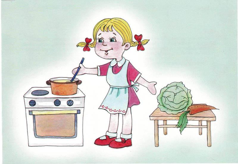 Девочка готовит обед. Она- хозяйственная и заботливая.