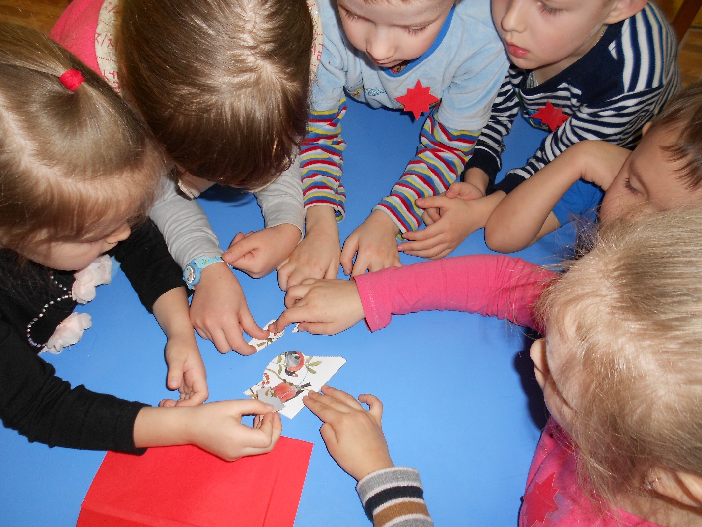 - А сейчас разделимся на 2 команды. Ребята из «Клуба зимующих птиц донской земли» приготовили 2 конверта. Ребята у кого прикреплены желтые звездочки подойдут к столу с желтым конвертом. А у кого красные звездочки подойдут к столу с красным конвертом, и выполнив задание вы узнаете название своей команды. Что там внутри? (разрезные картинки).