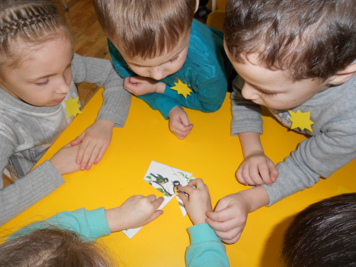 Предварительная работа: чтение сказки В. Бианки «Синичкин календарь», знакомство с понятием «зимующие», «перелетные», наблюдение за птицами, рассматривание картин о птицах.