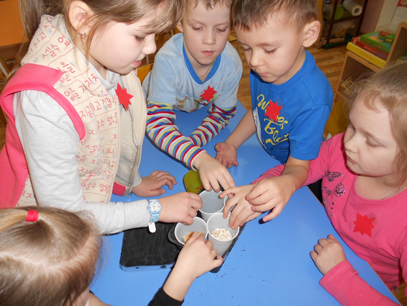 Ребята, достаньте стаканчики и рассмотрите их содержимое. Как вы думаете, что это (еда для птиц). Выберите то, чем можно покормить птиц. А стаканчики с вредной едой для птиц поставьте обратно в черный ящик