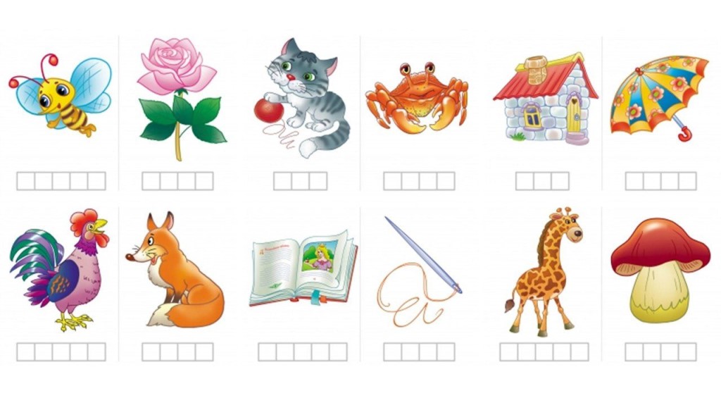 Задание №5 «Деление слов на слоги» (Карточки-картинки с окошками и простые карандаши на каждого ребёнка).