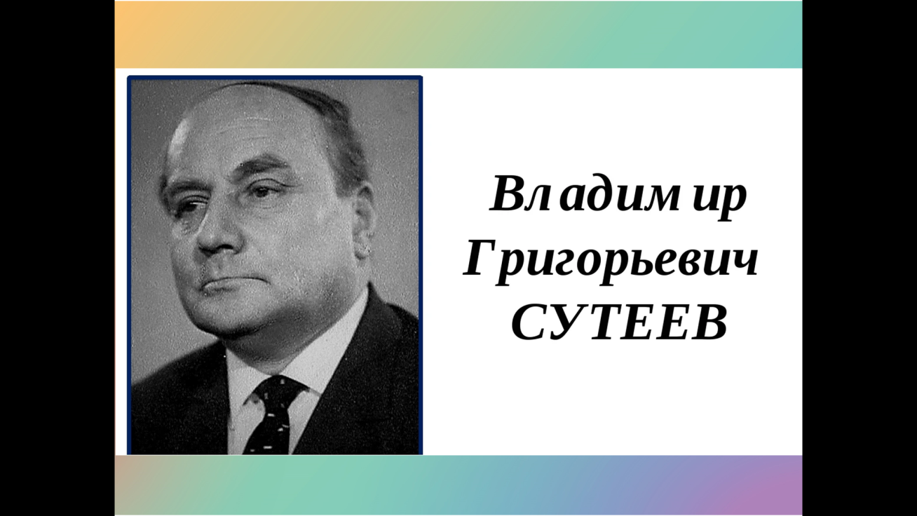 - Итак, жил да был на свете волшебник - Владимир Сутеев. Он рисовал картинки для детских книжек, сочинял сказки и снимал для ребят мультфильмы. И были у него три волшебные палочки –карандаш, кисточка и авторучка. Возьмет он одну в руку – история сочиняется, возьмёт две другие- рисунок чудесный выходит, красочный. И все его любили, потому что детские волшебники бывают только добрыми!