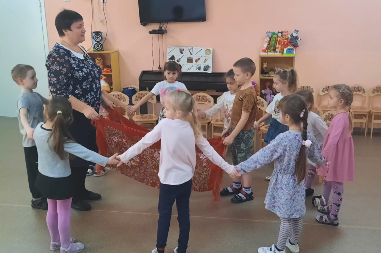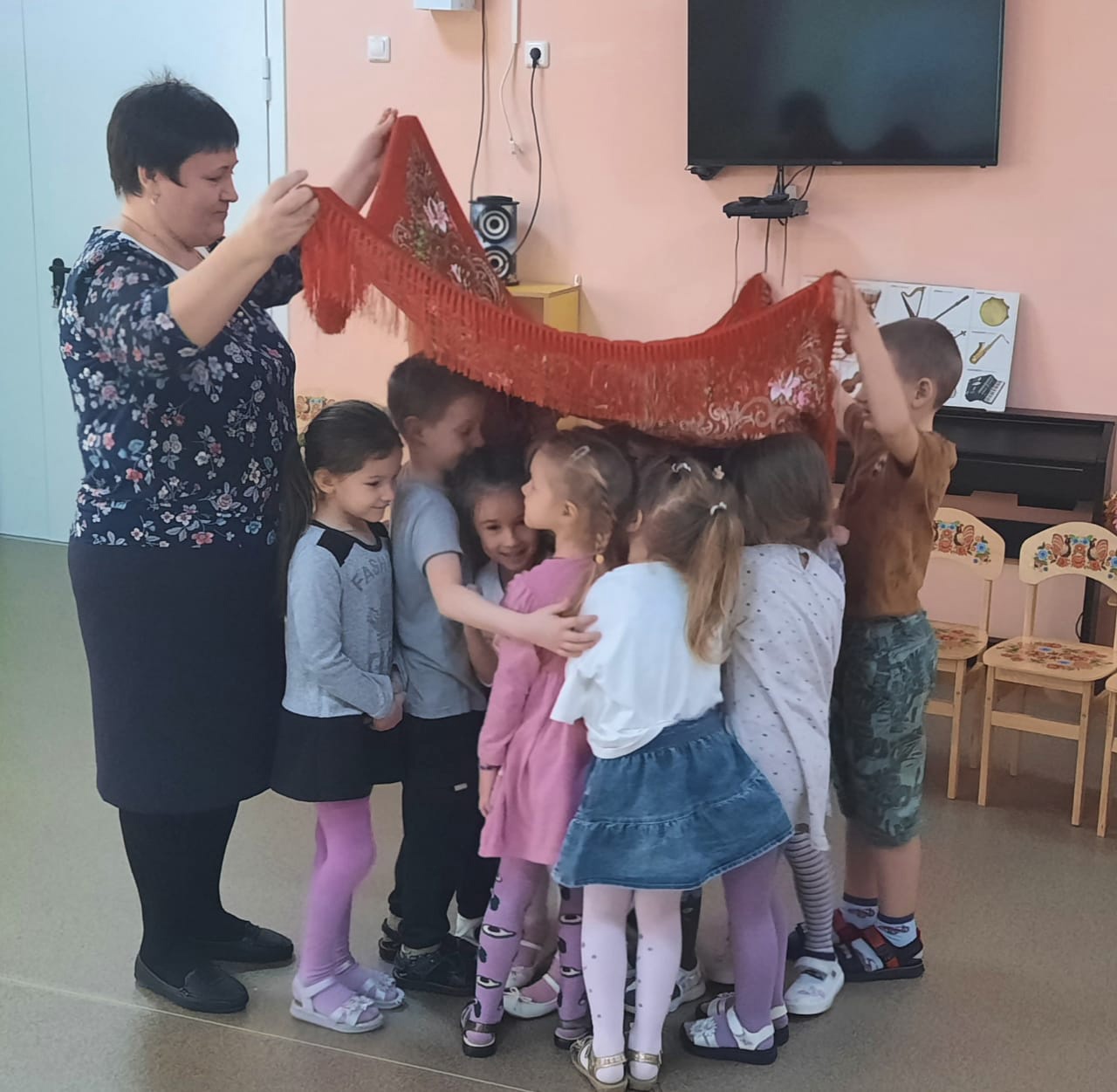 Воспитатель накрывает их легким красивым покрывалом. Если кто-то из детей не успел встать под покрывало, остальные берут его за руки и вводят в круг.