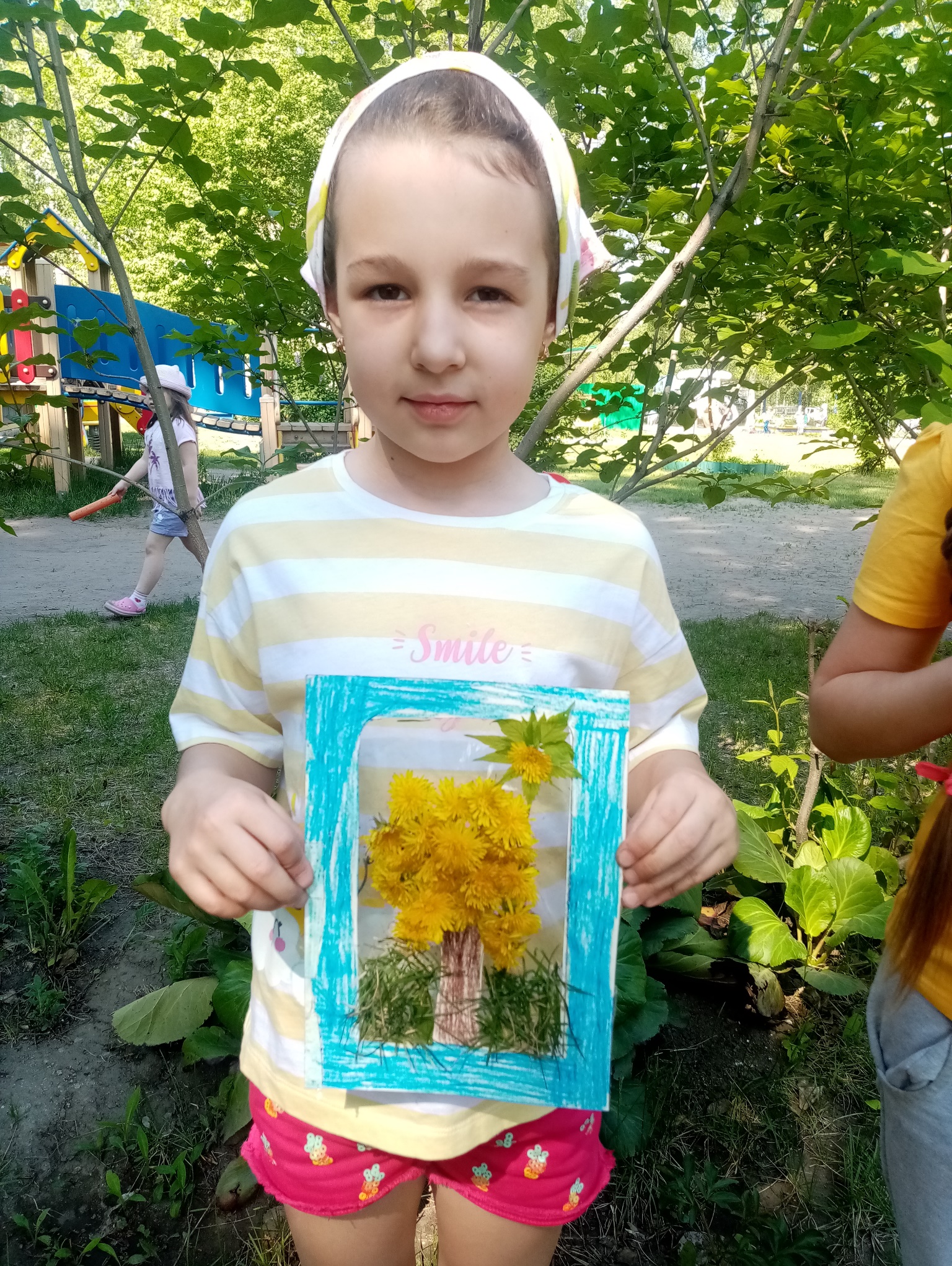 Приклеиваем шаблон к картону, вырезаем. Приклеиваем на рамку прозрачный скотч. Прозрачный скотч надо наклеивать липкой стороной вверх! Обрежьте лишний скотч по краю листа. Приклеить цветки одуванчика на шаблон. Вот какая картина получится у каждого ребенка!