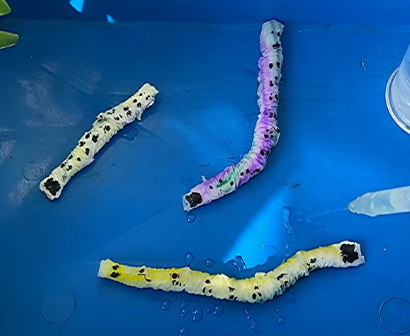 Отрезаем от салфетки часть, чтобы она была не шире нашей шпажки (карандаша или палочки). Закручиваем шпажку в салфетку, а потом аккуратно сдвигаем оба конца салфетки к центру. У нас должен получиться очень плотный участок гофрированной бумаги на шпажке. Это и есть наша гусеница. Аккуратно снимаем его со шпажки и кладем на тарелку. Набираем пипеткой воду и капаем на неё несколько капель в разных местах. Она начинает шевелиться и увеличиваться в размерах!