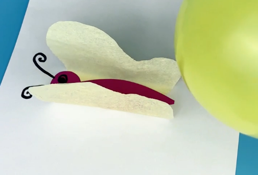 На сложенной салфетке, начиная от сгиба, рисуем крыло бабочки и вырезаем, не разрезая по центру. На лист бумаги приклеиваем одну пару крылышек. Из цветной бумаги вырезаем тело бабочки и голову, приклеиваем их к крылышкам. Рисуем ей глазки, ротик и усики. Теперь надуваем шарик, хорошо трем им о шерстяную, меховую вещь или волосы, тем самым электризуя его, и подносим к крылышкам. Крылья бабочки начинают двигаться за шариком!