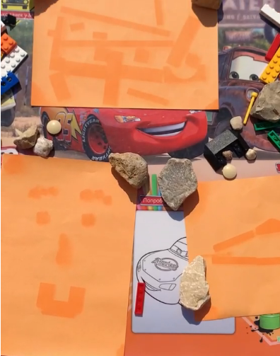 Выбираем солнечное место на открытом воздухе, потому что ультрафиолет не проходит сквозь стекло. Кладем наши листы разноцветной бумаги и создаем на них картинки с помощью любых предметов. Также, дополнительный рисунок можно сделать солнцезащитным кремом с помощью кисти, пальцев или ладони. На случай ветреной погоды прижимаем углы бумаги камнями. Теперь оставляем наш эксперимент на день-два, а затем проверим результат.