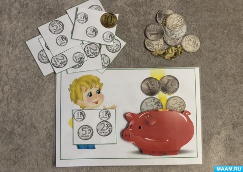 Восп.: Давайте покажем нашим героям, как мы умеем считать и копить деньги, беречь семейный бюджет. Игра «Собери монеты» (на каждого ребёнка)