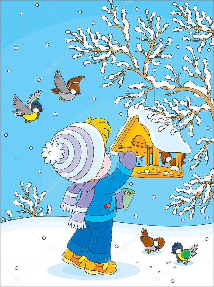 «Наступила … (зима). На улице стало …. (холодно), выпал … (снег). Ваня надел тёплую …(курточку), тёплые … (штанишки), … (шапочку), завязал …(шарфик), на ножки … (сапожки) и вышли …(на улицу, в парк). Там он увидел … (птиц: синиц и воробьёв, кормушку). Он принес для птиц …(семечки, зернышки, хлебные крошки). Он кормит … (птиц). Птички прилетели, чтобы … (покушать). Ване кормить птиц очень …(нравиться).