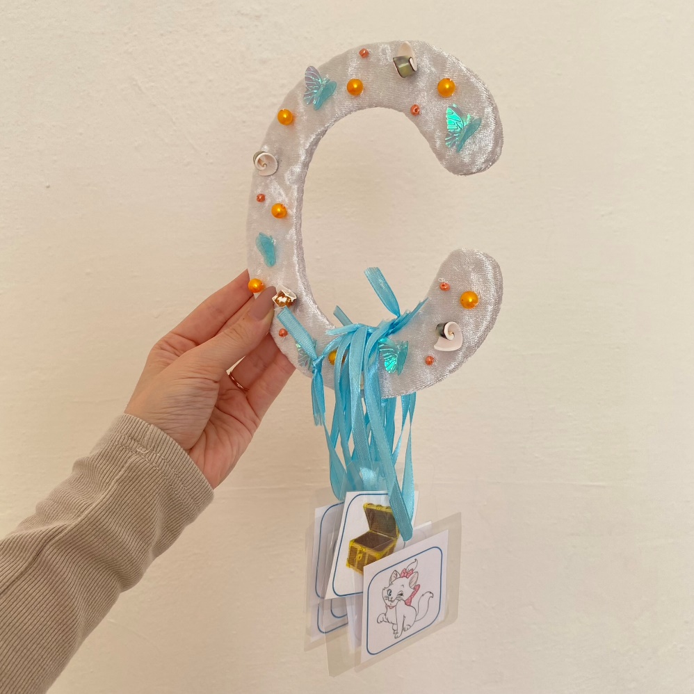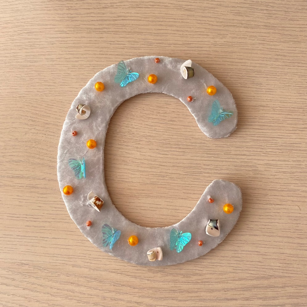 Посмотрите, какой он красивый. Хотите его потрогать? Не стесняйтесь. Давайте ручками ощутим все украшения на нашем звуке. Что на нем есть? (Бусы, ракушки, бабочки)