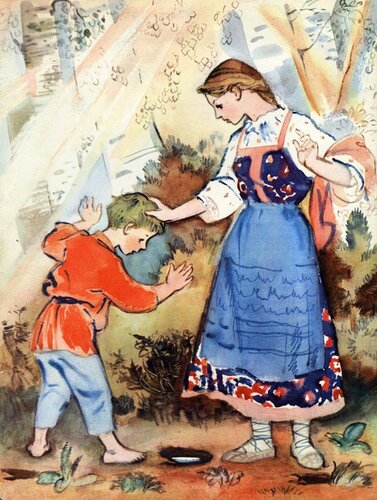 Пошла Алёнушка на работу и братца с собой взяла. Идут они по дальнему пути, по широкому полю, и захотелось Иванушке пить.