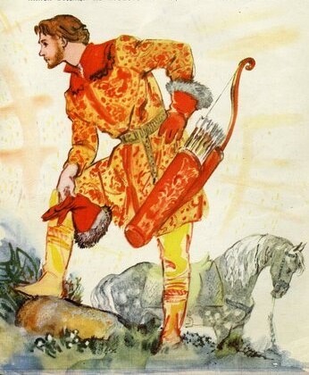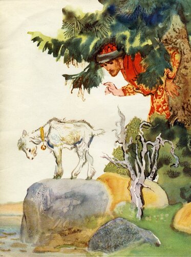 Пошёл слуга на реку и видит: по берегу бегает козлёночек и жалобнёшенько зовет: