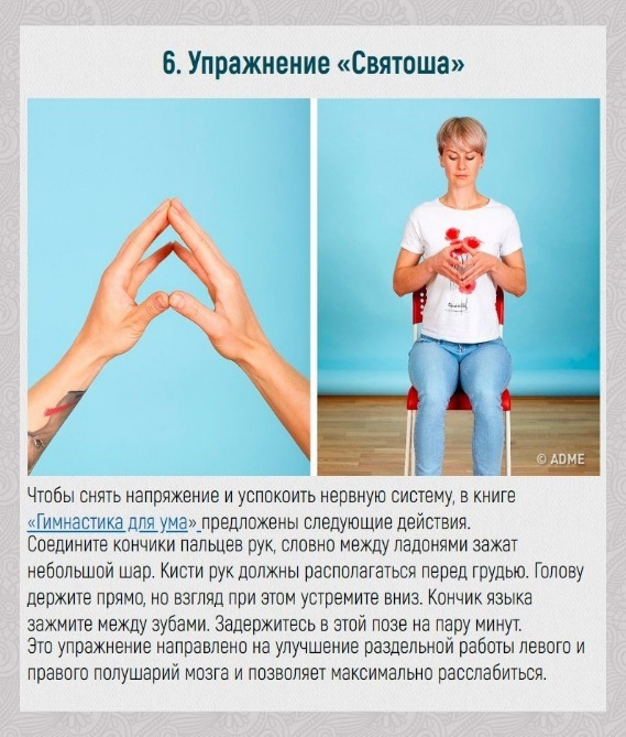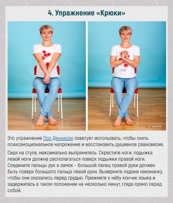 Чтобы снять напряжение, успокоить нервную систему, сосредоточиться и быстро восстановить психоэмоциональное равновесие — необходимо сесть на стул, скрестить ноги, положив лодыжку левой ноги на голень правой ноги. Затем скрестите руки, положив запястье правой руки на запястье левой руки, после чего соединить пальцы в замок, так, чтобы большой палец правой руки оказался поверх большого пальца левой руки. Вывернуть соединенные в замок руки перед грудью «наизнанку», чтобы сцепленные пальцы были направлены кверху. Смотреть прямо, взгляд вверх, кончик языка прижат к верхнему небу (можно на вдохе прижимать к твердому небу кончик языка, расслабляя его на выдохе). Посидеть в этой позе 1-5 минут до появления зевоты или до ощущения достаточности. Кинезиологи утверждают, что при таком перекрещивании рук, ног и пальцев происходят сложные процессы, приводящие к сбалансированной работе моторных и сенсорных центров как каждого полушария мозга, так и среднего мозга, который находится прямо над твердым небом. При этом достигается объединение эмоций и процессов мышления (усиление межполушарной интеграции), приводя к наиболее эффективной работе (обучению) и реагированию на события.