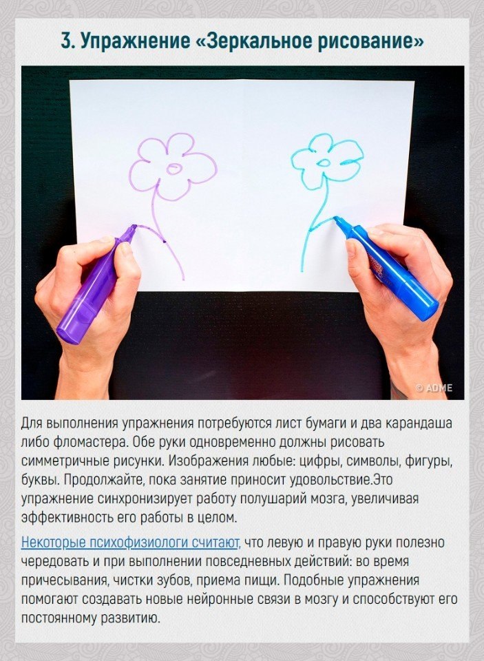 Положить на стол чистый лист бумаги. Взять в обе руки по карандашу. Начать рисовать одновременно обеими руками зеркально-симметричные рисунки, буквы, цифры. При выполнении этого упражнения расслабляются глаза и руки. Когда деятельность обоих полушарий мозга синхронизируется, заметно увеличится эффективность работы всего мозга. К слову, в кинезиологии есть такой интересный прием, не только полезный, но и увлекательный. Большинство из нас выполняют рутинные ежедневные физические действия правой рукой (левши – левой). А что, если поэкспериментировать, пробуя чистить зубы, причесываться, брать в руки те или иные предметы и так далее, другой рукой? Исследования показывают, что выполнение обычного действия «неудобной» рукой активирует новые области мозга и помогает развивать новые контакты между клетками мозга. Такие упражнения очень нравятся детям.