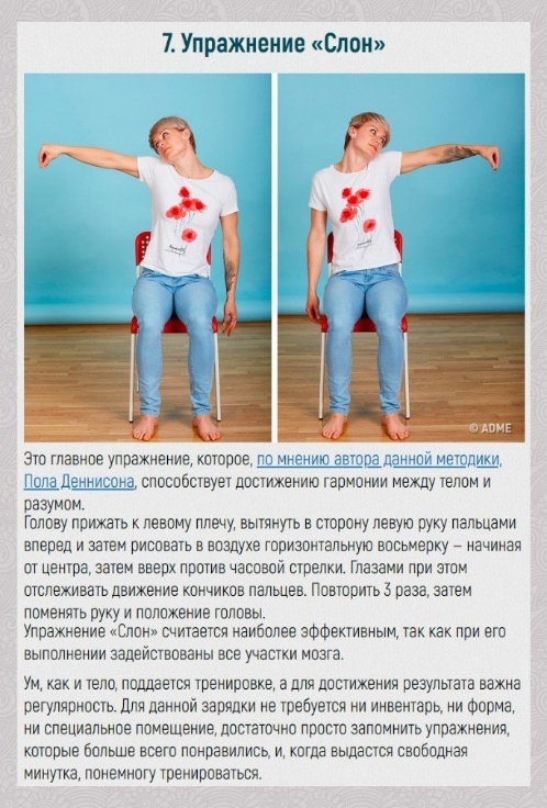 Это одно из самых интегрирующих упражнений Пола Деннисона «гимнастика мозга». Оно активизирует и балансирует всю целостную систему организма «интеллект—тело», улучшает концентрацию внимания. Ухо плотно прижать к плечу. Одновременно вытянуть одну руку, как хобот слона, и начать рисовать ею горизонтальную восьмерку, начиная от центра зрительного поля и идя вверх против часовой стрелки. Глаза следят за движениями кончиков пальцев. Потом поменять руки. Упражнение выполнять медленно, по 3-5 раз каждой рукой.