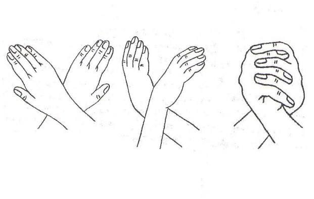 указательный и средний пальцы каждой руки прижаты к ладоням, основания ладоней и кончики безымянных пальцев соприкасаются).