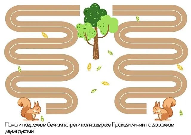Игра 1. Обведи линии обеими руками одновременно. Тренирует и улучшает работу взаимодействие между полушариями мозга.