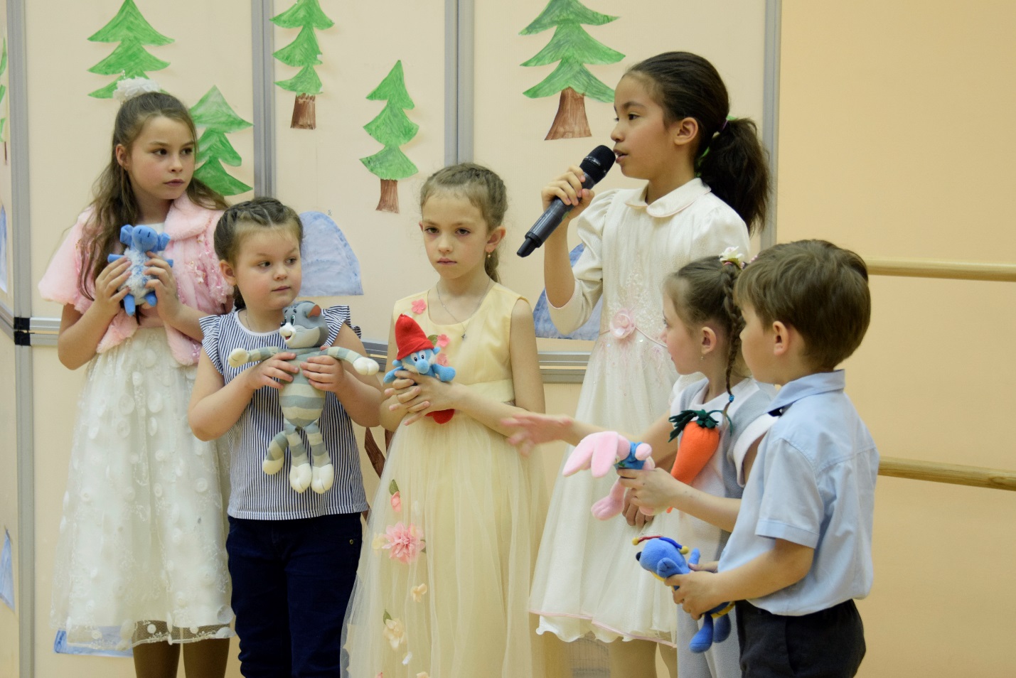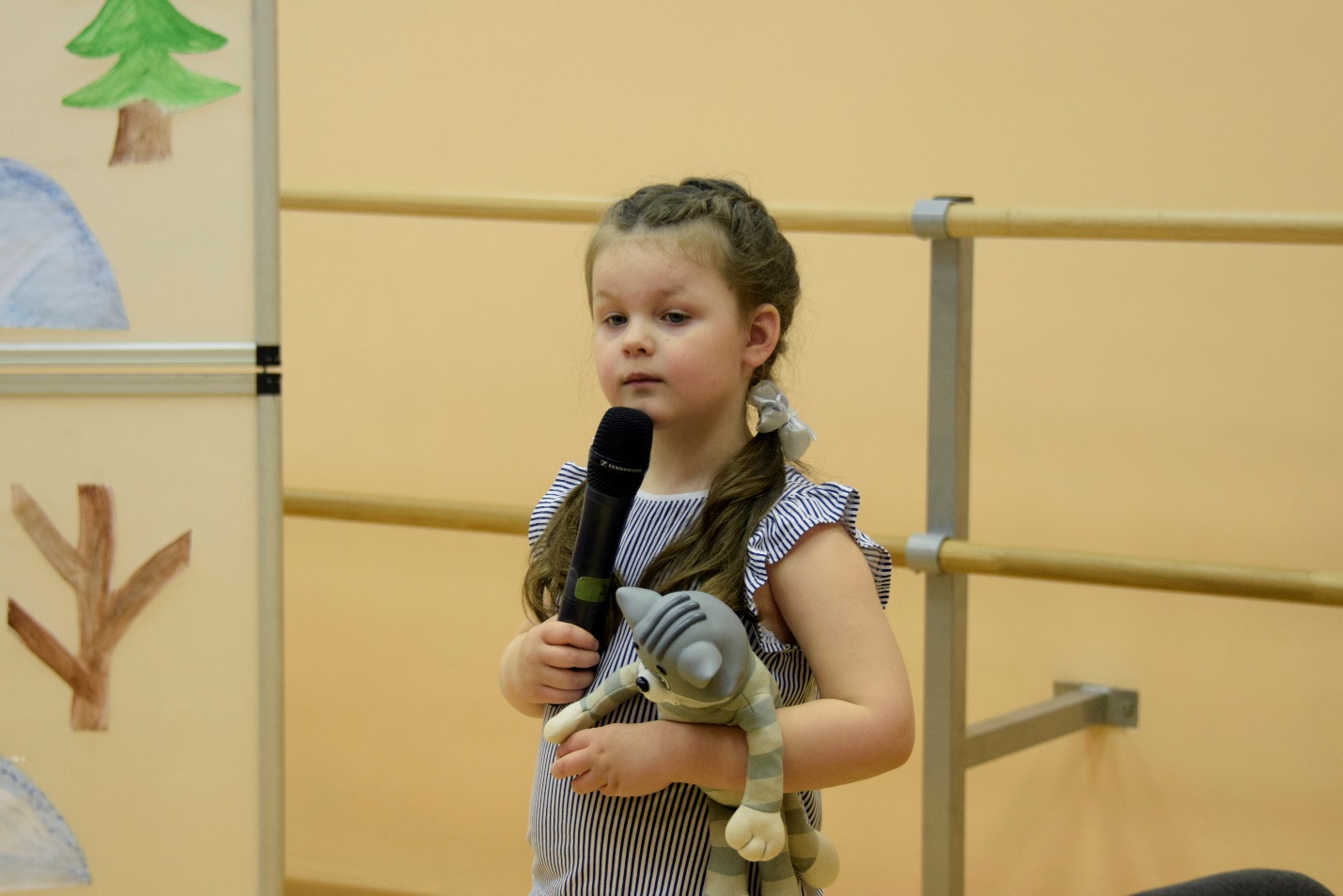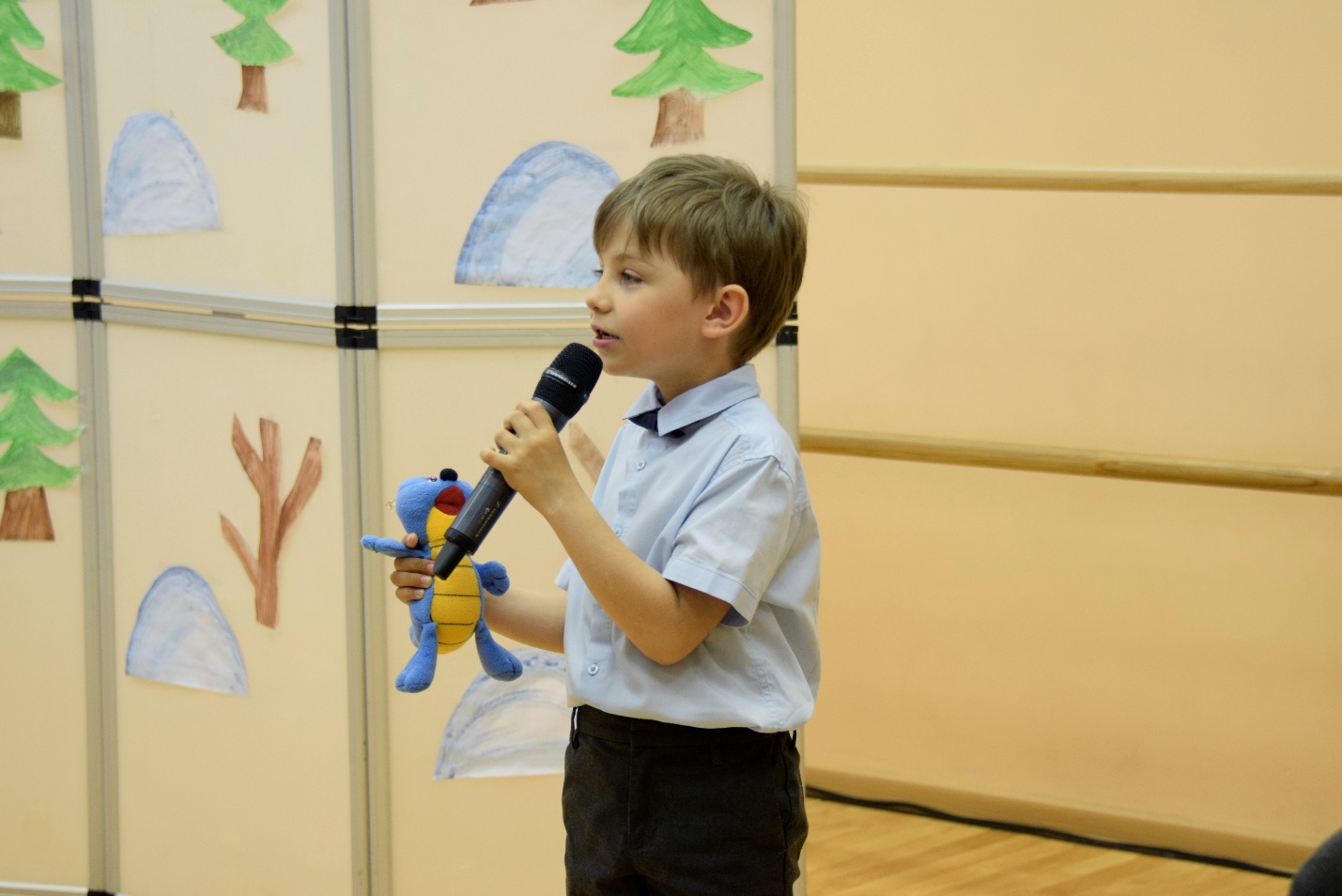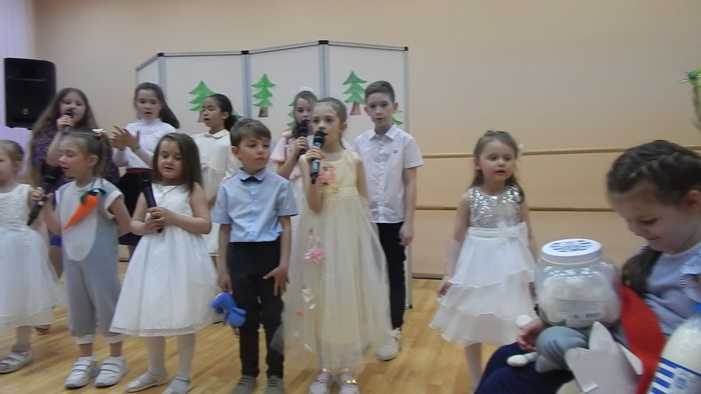 Кот-матроскин выводит на сцену за руку Зайчика-марковку.