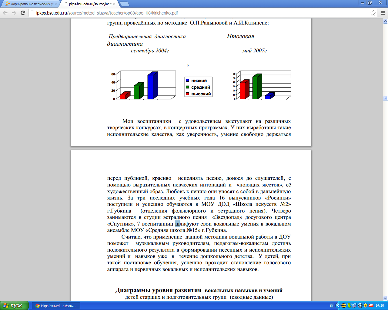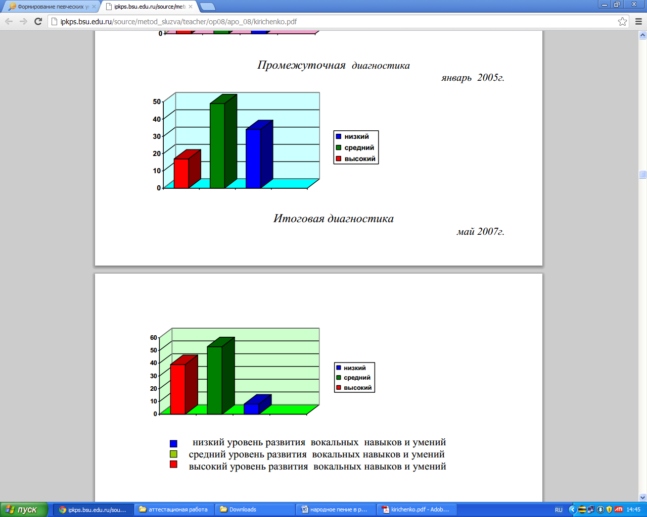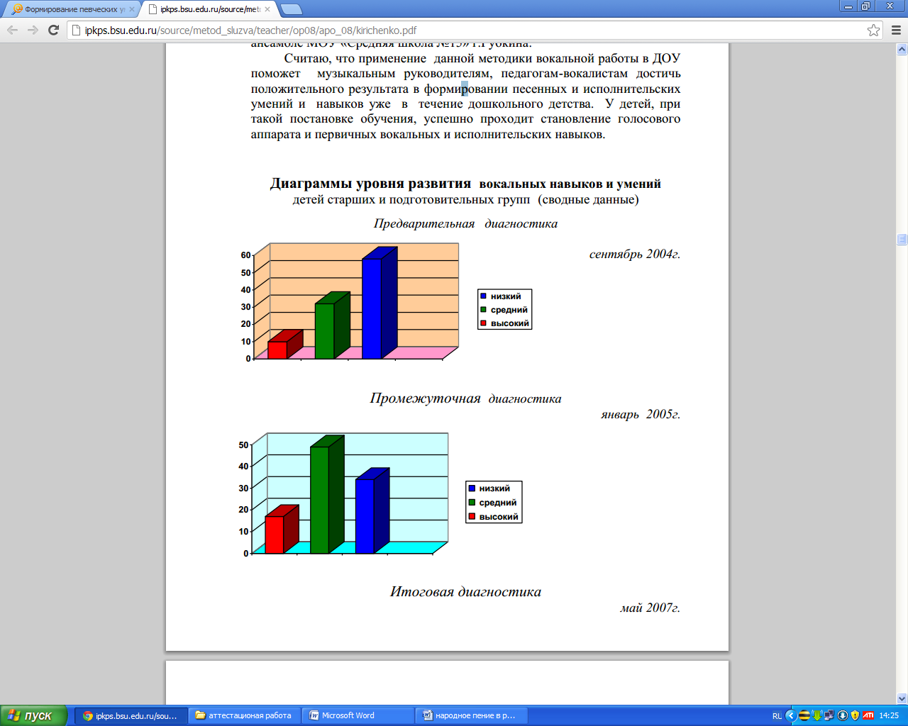 • опытно-экспериментальным путем проверена эффективность методики вокально-эстетического воспитания детей средствами традиционной певческой культуры.