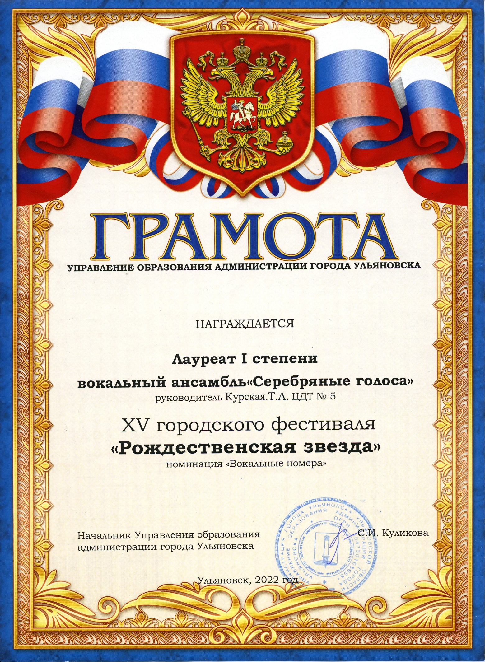 Педагог: «Песня «Хрустальный лёд» музыка В. Овсянников, слова А. Шаганов, вокальная аранжировка Т. Курская, занимает особое место в репертуаре вокального объединения «СЕРЕБРЯНЫЕ ГОЛОСА». Исполнение этой песни на XV Городском фестивале «Рождественская звезда» принесло нам победу. Ансамбль стал Лауреатом I степени». (Приложение №3)