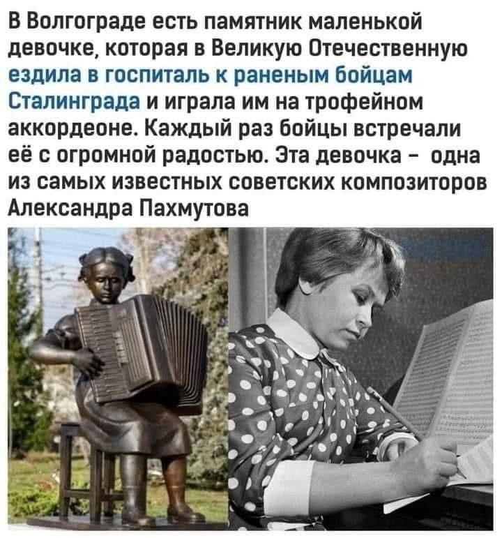 Юная девочка с косичками и аккордеоном, сидящая на табуретке среди берез и елей – это знаменитая Александра Пахмутова, известный всему миру композитор, написавший огромное количество любимых народом песен. Это уже позже, а тогда во время войны Александра на трофейном аккордеоне играла раненым в госпиталях.