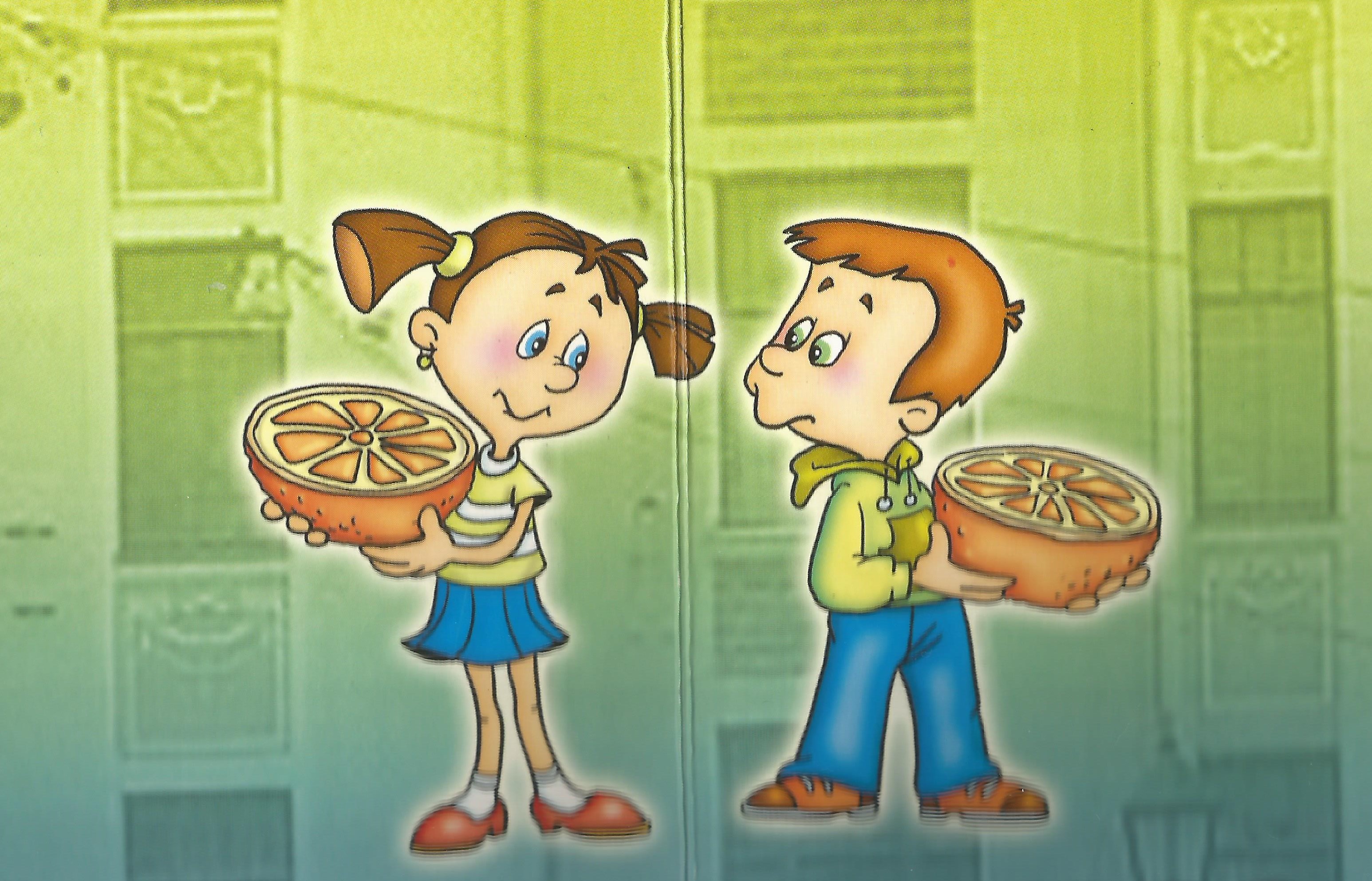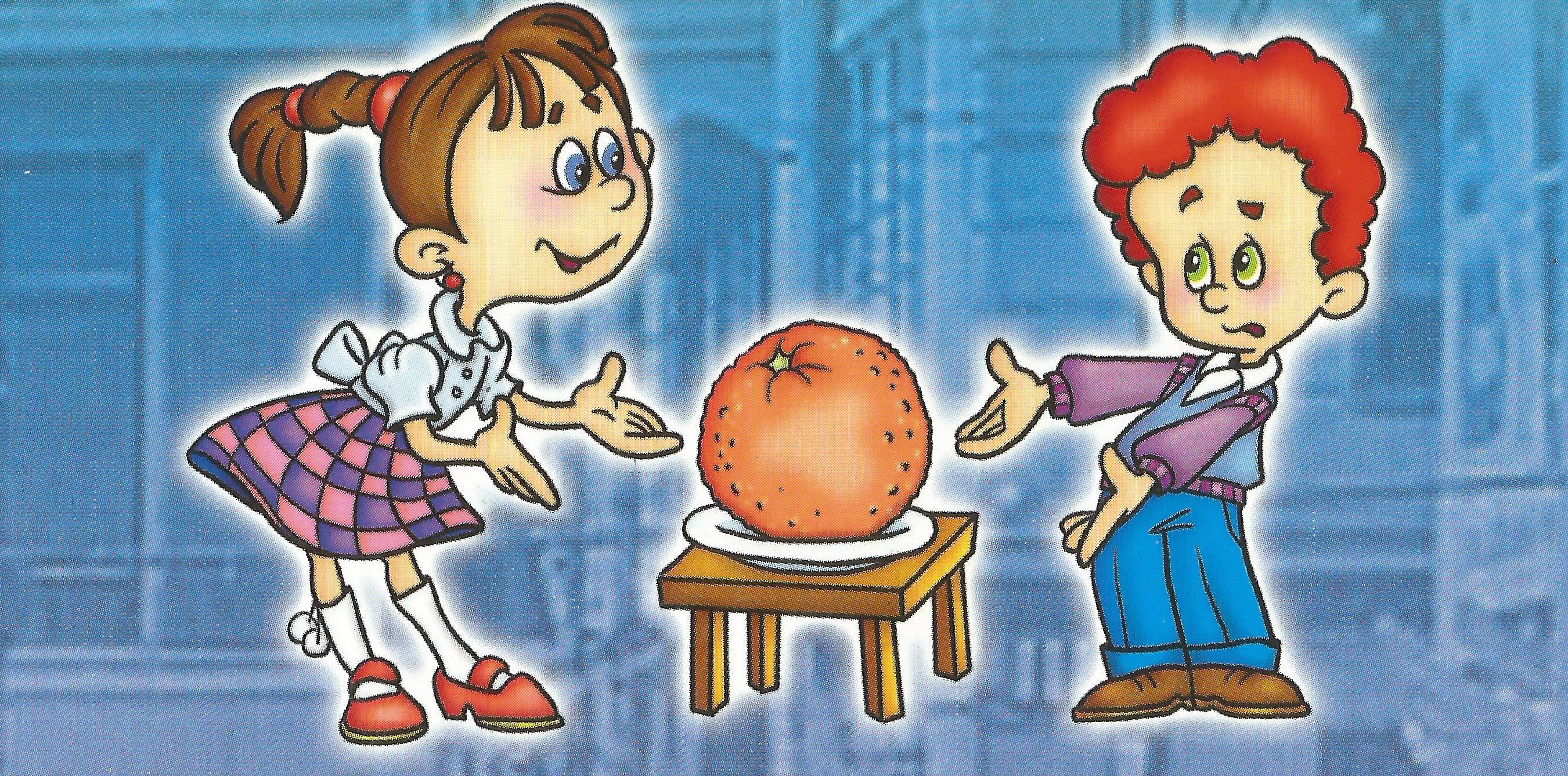 Класс делится на группы по 4 человека, каждой группе выдаётся чистый лист. Ведущий задаёт группам следующую ситуацию: «Имеется 1 апельсин и 2 друга. Как разделить апельсин между друзьями».