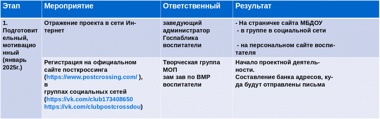 4 | Задачи проекта: - Воспитывать интерес детей к родной стране, родному языку, природе, достопримечательностям, истории чувство гордости за свою страну, ее культуру, достижения. - Формировать представления о работе электронной почты - Создавать в группе предметно-развивающую среду, способствующую развитию познавательной деятельности дошкольников. -Развивать умение составлять рассказы из личного опыта и на заданную тему. -Развивать творческие способности в процессе обмена открытками, рисунками, фотографиями. Тип проекта: творческий, практико – ориентированный, познавательно – исследовательский. Вид проекта: долгосрочный (январь-декабрь 2025г.) Участники проекта: дети старших и подготовительных групп, родители, педагоги. |