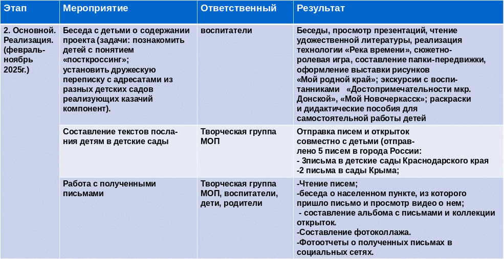 2 | Посткроссинг – международный проект по обмену почтовыми открытками. В нашем случае, это переписка более широкого уровня, с обменом информацией об истории городов и поселков, где проживают адресаты Автором проекта является португалец Паоло Магляшем, в 2005 году, в век информационных писем, истосковавшийся по бумажной или «живой» переписке, решил создать инновационный проект, суть которого состоит в обмене открытками из разных стран мира. Более 50 миллионов открыток отправлено по всему миру, данные на 2024 год. Преимущества для детей это расширение кругозора, развитие письменной речи, знакомство с географией и культурой. |