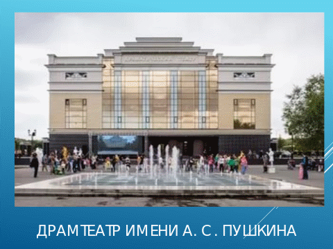 Ведущий:Молодцы, ребята. Вы - очень творческие ребята, и много сказок знаете. Давайте поаплодируем себе. А мы продолжаем наше путешествие. Что находится прямо за зданием драмтеатра. Обратите внимание на слайд. (Слайд №8, Приложение 1)