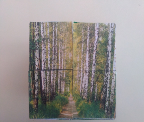 - Работа с трансформируемым, ассоциативным кубом (заполнение грани куба картинкой с ассоциацией ребёнка на словосочетание «родная природа»)