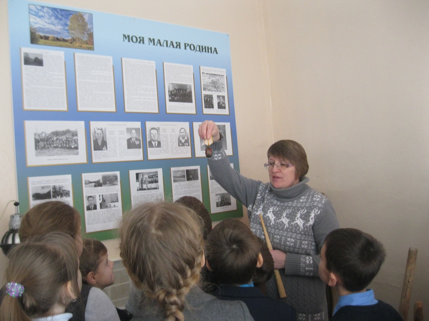 В школьном музее (Экскурсию проводит заведующая музеем –