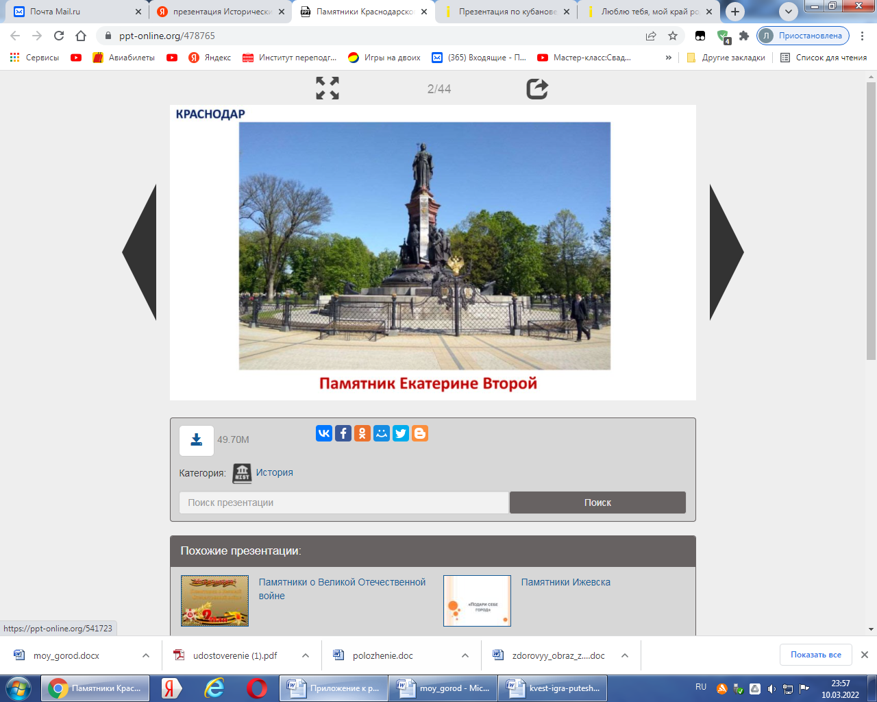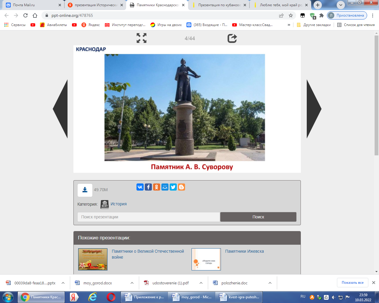 «Культурное наследие» | 1. Интерактивная игра «Знаешь ли ты памятники родного края» (Приложение 3) Время выполнения задания 10 мин. | Презентация с историческими и культурными памятниками губернии у ответственного по станции. Ключевое слово ВСЕЙ | Количество баллов, заработанное командой, соответствует количеству правильных ответов. |