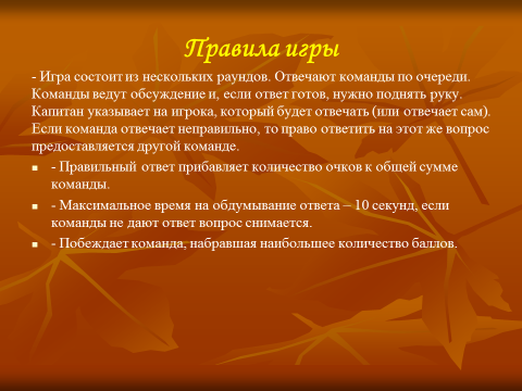- Максимальное время на обдумывание ответа – 10 секунд, если команды не дают ответ вопрос снимается.