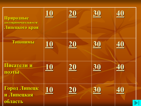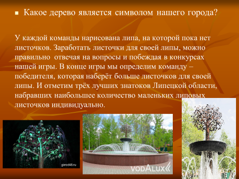 У каждой команды нарисована липа, на которой пока нет листочков. Заработать листочки для своей липы, можно правильно отвечая на вопросы и побеждая в конкурсах нашей игры. В конце игры мы определим команду – победителя, которая наберёт больше листочков для своей липы. 1 листик=10 баллам.