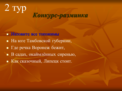 Оборудование: компьютер, проектор, презентация, объявление о мероприятии, рисунки Липецка, две шляпы, музыкальное сопровождение, деревья, липовые листики, грамоты, медали, раздаточный материал.