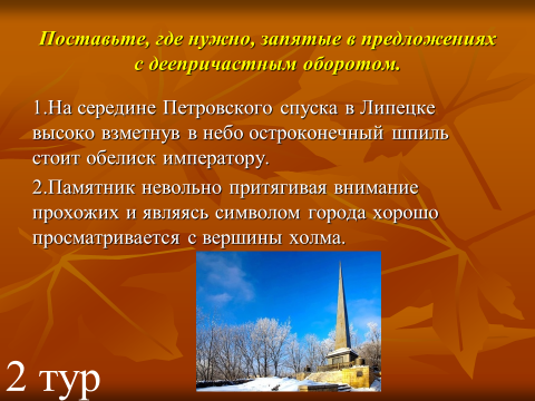 1.На середине Петровского спуска в Липецке, высоко взметнув в небо остроконечный шпиль, стоит обелиск императору.