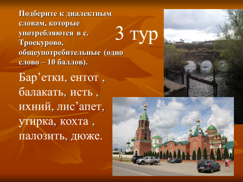 Подберите к диалектным словам, которые употребляются в с. Троекурово, общеупотребительные (одно слово – 1 балл, максимальное количество баллов – 10).Бар’етки -туфли,