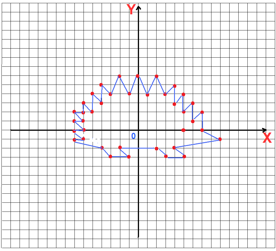 (-6;3); (-5;-2); (-5;4); (-4;3); (-4;5); (-3;4); (-2;6); (-1;4); (0;6); (1;4); (2;6); (3;4); (4;5); (4;3); (5;4); (5;2); (6;3); (6;1); (7;2); (7;0); (9;-1); (4;-2); (5;-3); (3;-3); (2;-2); (-2;-2); (-1;-3); Глаз (5;0)