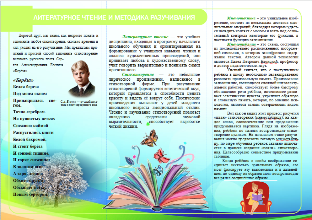 4. Провести отбор информации для создания буклета по разучиванию стихотворения «Берёза.» С. А. Есенин детьми 2 класса.