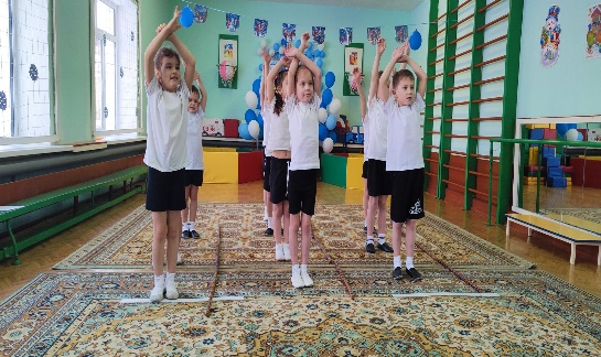 Воспитатель:Ребята, так как у каждого из нас в руках палочки – выручалочки, предлагаю их познакомить с нашим спортивным залом.(Под музыкальное сопровождение дети выполняют упражнения)