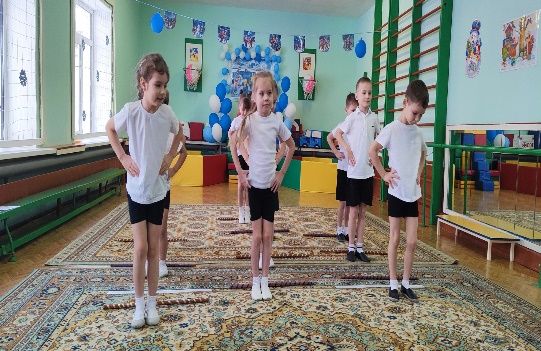 - Совершенствовать умение сохранять равновесие при ходьбе змейкой и прыжках на двух ногах через гимнастическую палку;